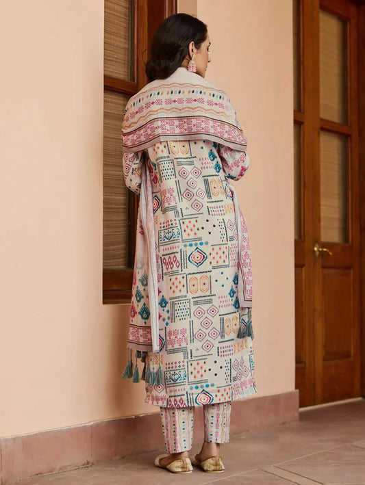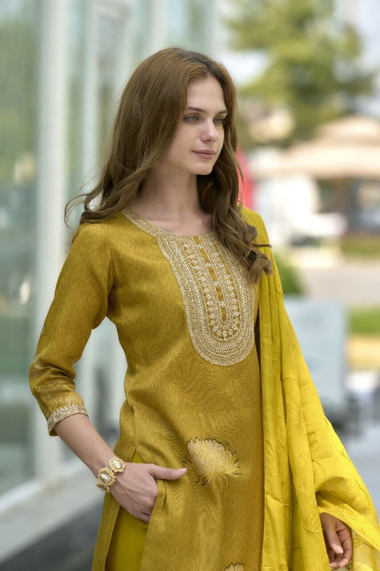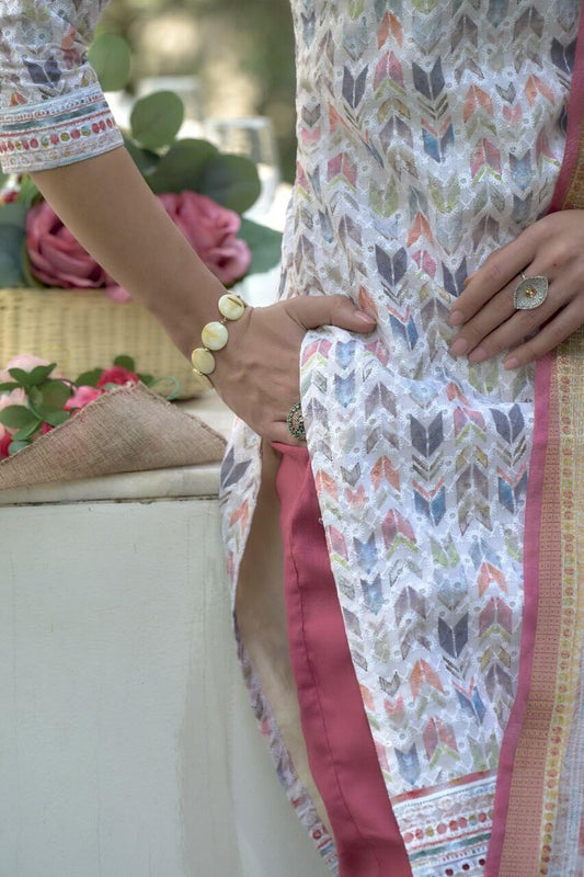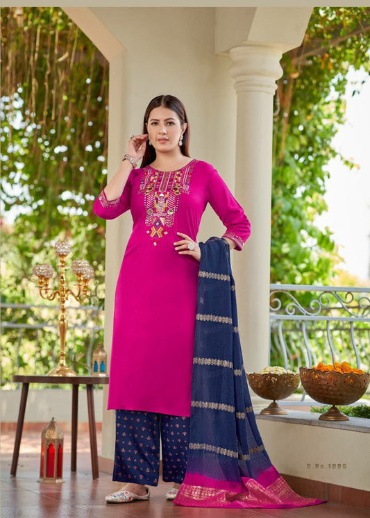 We offer straight-cut suit sets, Anarkali styles, A-line or flared designs, palazzo or sharara suit sets, and pencil suit sets in fabrics like pure viscose chinon, viscose rayon embroidery, and pure muslin digital prints.