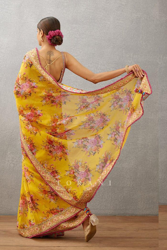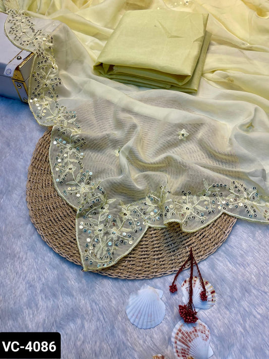 6.3 meters long and comes with an unstitched blouse piece so you can tailor it