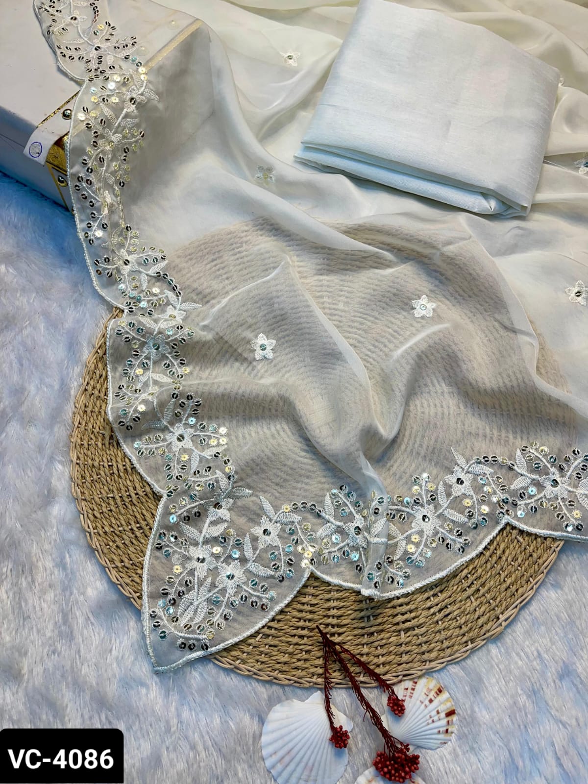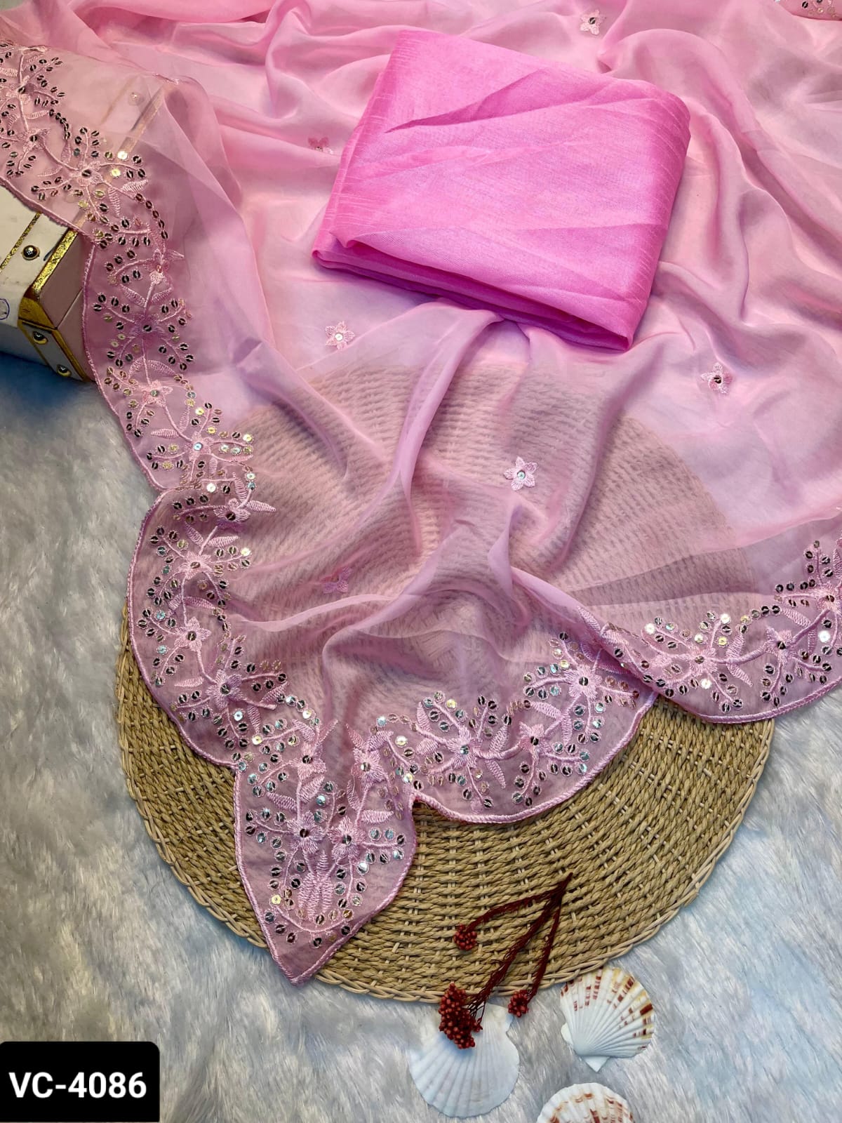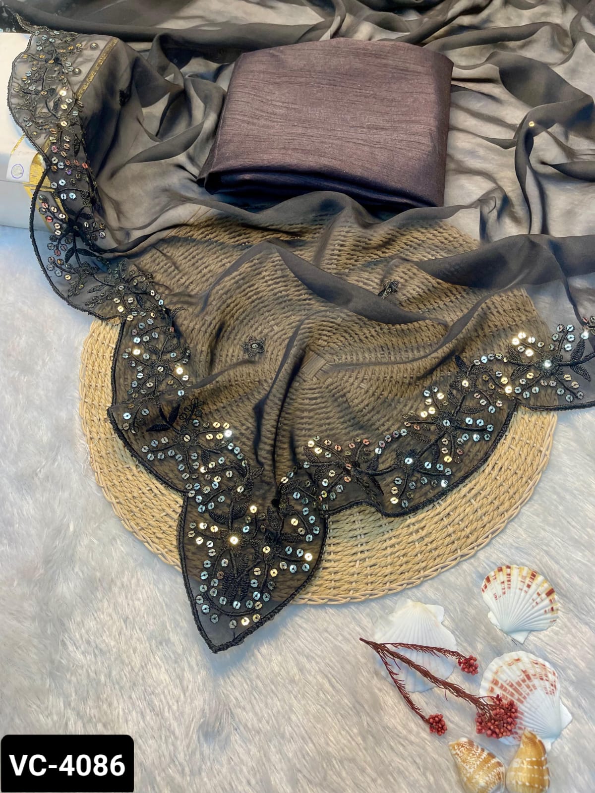 SAREES :Soft Tabby orgenza fabric sequins embroidered work with embroidered arco cut border